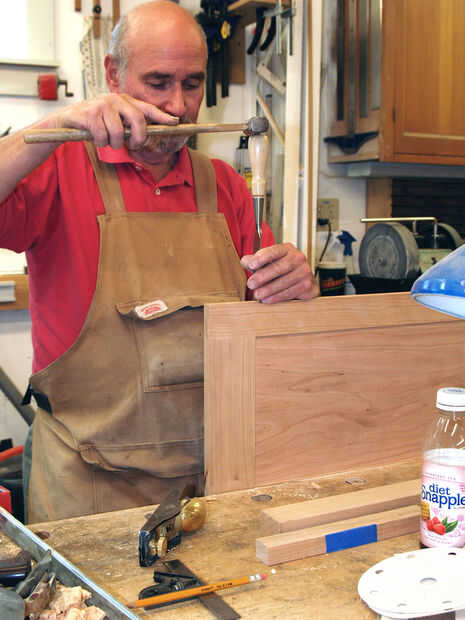 Los marcos de las puertas se hacen con mortajas en los montantes de la puerta y los carriles con espigas sueltas. Siga los mismos procedimientos de presentación y utilice un router horizontal o un router de mano para cortar las mortajas. Las mortajas de la parte superior de las puertas son ¼" de alto, 1 ¼" amplia y ¾" profundo. Las mortajas para la parte inferior de las puertas es de 2" de ancho.