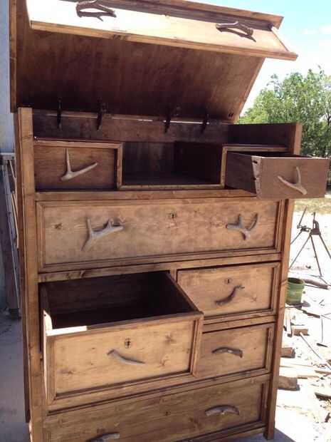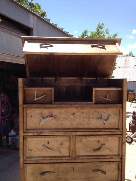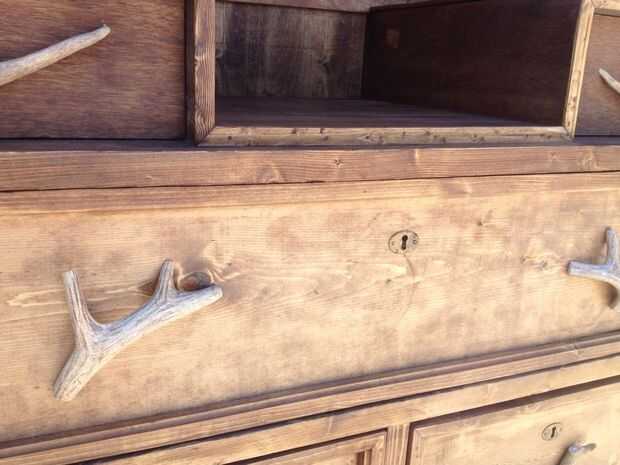 Después de ajustar la tapa de la parte posterior con bisagras, decidí que quería que la tapa permanezca abierto por sí mismo.  Así que añadido soportes de tapa de caja de juguete, se puede comprar en la mayoría de tiendas de mejoras para el hogar.  Tuve que usar cuatro debido al peso y cómo se forma la tapa.   He añadido chapetones de latón para dar un aspecto antiguo y las cornamentas de los ciervos para el look rústico.  Tomé ciervos de tamaño completo las cornamentas y cortar hasta el tamaño que quería.  Luego tomar el cajón y las espaldas de ellos en un ángulo que permita que encaja plana contra el frente del cajón de arena.  Atornille la cornamenta de la parte posterior de la cara del cajón.  No se olvide de los espacio uniformemente a lo largo de la cómoda para que se vea bonito.  Último paso he añadido cuero marrón en la parte superior de los dos pequeños cajones en la parte superior para dar una agradable sensación lujosa en el interior.