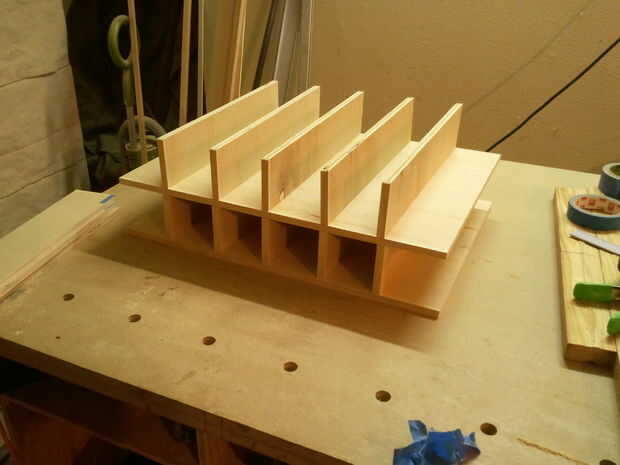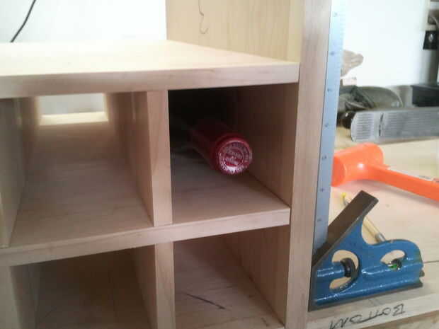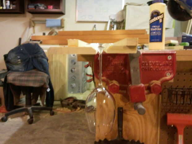 Medir su abertura y dividirla hasta ajuste el tamaño del vino botellas que desee. Los titulares de la Copa de vino se hacen con un router y un poco de bisel. Luego se pegan a otra franja de álamo. Como se puede ver tienen un vidrio muy bien.