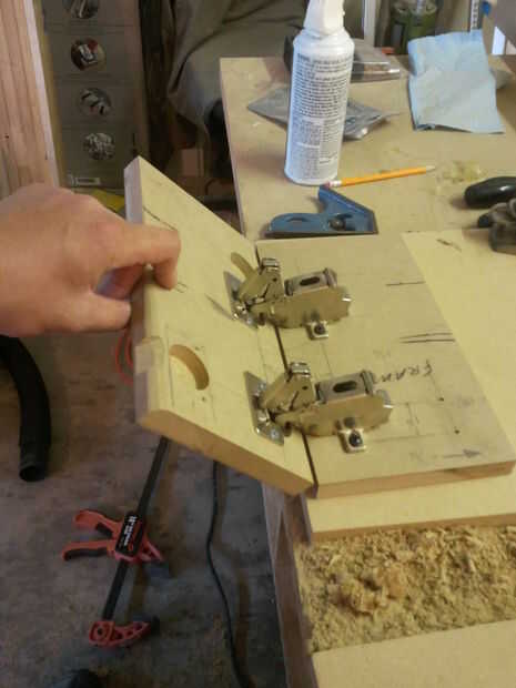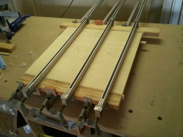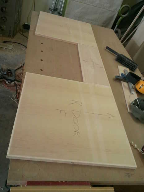 Las puertas y frentes de cajón se fabrican con madera contrachapada del arce y luego se enfrentan con algunos arce. Las tiras de arce se cortan con una sierra de corte al ras.