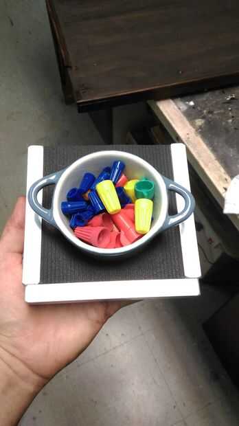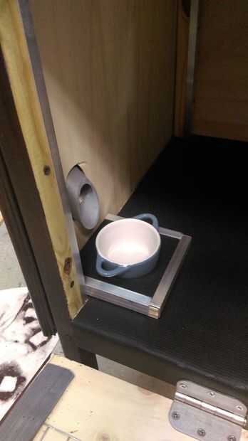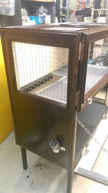 Cuando sea el momento para alimentar el conejo, el punk poco obtiene tan emocionada y generalmente golpea su mano con la comida en ella antes de que se puede fijar hacia abajo así que bolitas de comida por todas partes. Así que hice un alimento disparar para que su uso por lo que ni siquiera tienen que abrir la puerta. Corté un agujero en el lado de los estantes, luego cortar algún tubo de pvc en un ángulo con el inglete vio y había atado con una correa de suspensión de pvc. (Aerosol pintado la plata de pvc para que coincida con el hardware primero) Entonces hice una pequeña pieza del plato de comida a Nestlé en. Me corte un cuadrado de alguna madera de media pulgada y corte un agujero en el centro. Puse algunas de la alfombra negra y cubre las esquinas con las piezas de aluminio. Entonces clavó hasta el fondo que era fijo y no se mueva alrededor de la jaula. El tazón de fuente es extraíble por lo que se puede limpiar Los capuchones son sólo para simbolizar los pellets de alimento.