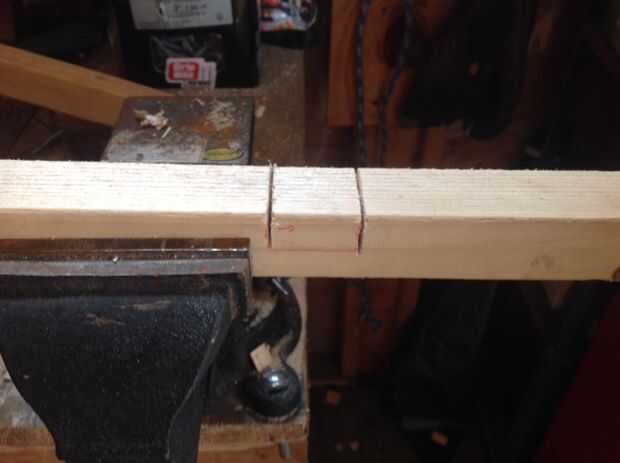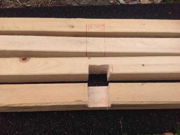 B (2) - lo mejor es cortar la sección A y B haces Junta, forma una A y una B de cada haz de luz. Esto es porque las vigas A requerir 4'2 "mientras las vigas B deben ser 3'10" largo, que goza de la longitud total de las vigas de 8'. Se forman las patas de la estructura con las vigas A ser las patas delanteras y los rayos B están las patas traseras. Debido a que estamos tratando de la azotea de la cuesta, el corte también tendrá que ser aproximadamente 1/4" de más agudo que un ángulo recto. Las secciones A va a necesitar un recorte conjunto de vuelta en (1.5" de largo, 3/4" de grosor) exactamente 2' desde el extremo de la tierra plana, pero en el lado que se enfrentará a la parte posterior de la unidad de estantes. Secciones B tendrá el misma vuelta conjunta corte pero en el lado que va al frente de la unidad de estantes. Usando una sierra o cincel junto con un regular Sierra voluntad sea necesario. Hacer dos cortes en el madera primero antes de cortar o picar la sección entre ellos como se indica en las imágenes.