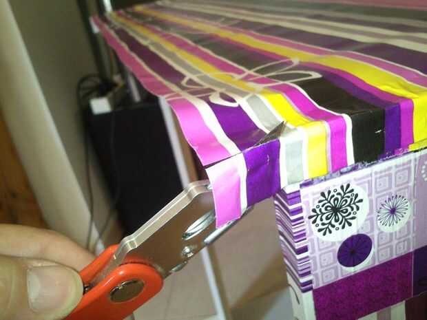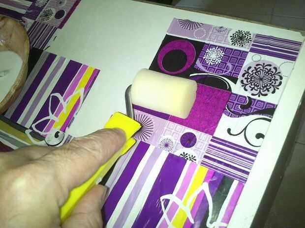 Después pegan un lado (laterales, superior o los cajones) para prevenir las arrugas sobre que he encontrado es una buena idea lo cepillo para arriba otra vez con una regla de pintura seca. Para ello es bueno no presione la regla demasiado, porque sólo se necesita para ocultar un poco las arrugas, y si presiona demasiado, puede romper el papel...