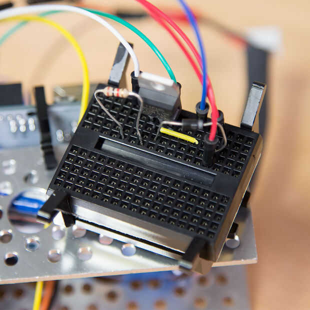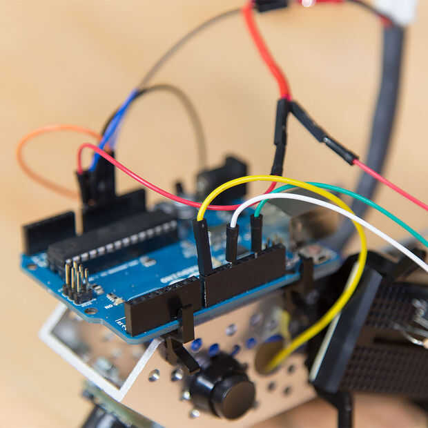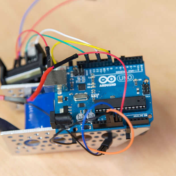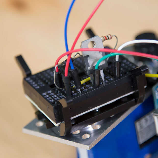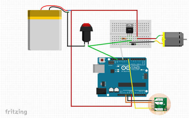 Empecé con mi controlador de motor barato simple y enganchado encima de la energía para el sensor y el pin pwm en el sensor a pin8 en el arduino. También he añadido un pulsador SPST para que fácilmente podría dar vuelta el proyecto encendido y apagado.
