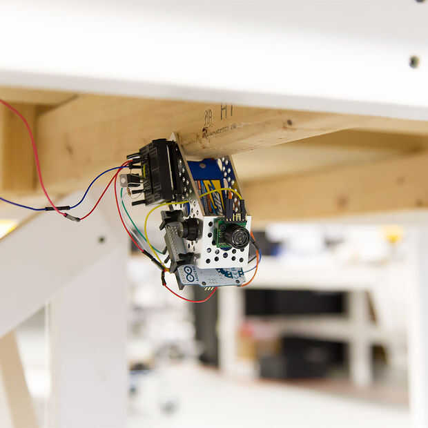 Ahora montar el cerebro y la fuerza en la parte inferior de una mesa o Banco de trabajo. Tuve suerte de tener la mesa de trabajo perfecto, con algunos 2x4s conveniente montar los cerebros a. Montaje los cerebros suficientemente lejos detrás hecho totalmente oculto a nadie más alto que un niño.
