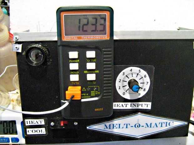 El cautín es la base de la calefacción, que es controlada por un regulador de la energía SCR. Se retira la punta y un bloque de aluminio se une en su lugar, conectado por abolt que tiene su cabeza cortada. Agujeros son perforados en el bloque de los capilares y el sensor del termopar. El blanco ilumina la muestra de la parte posterior, y la lupa muestra una vista ampliada de las muestras. Dos ventiladores proporcionan enfriamiento rápido entre las mediciones, y un termómetro digital indica la temperatura de la muestra.