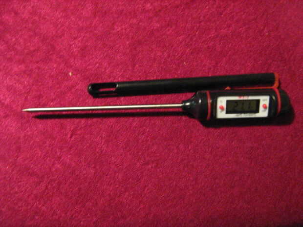 § Este modelo da lecturas a ± 0,1 oC y tiene una función de retención de datos que es muy conveniente. Un modelo más barato ($ 6,00) que lee a ± 1 oC puede sustituirse si se acepta menos precisión. También puede utilizarse un termómetro de carne digital como se muestra arriba.