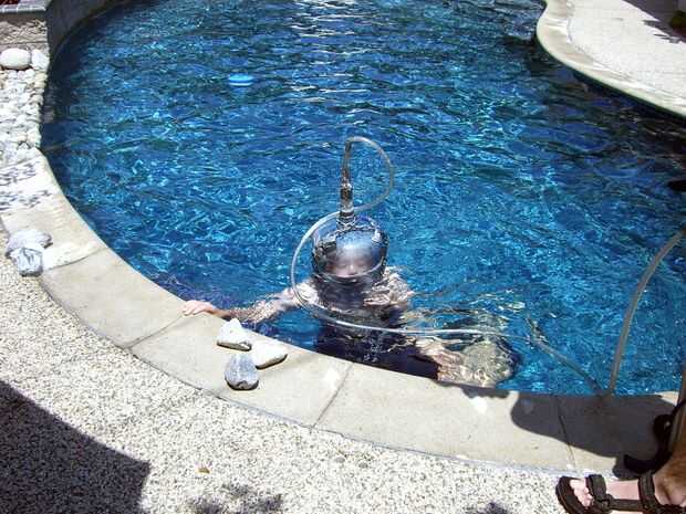 Soltar el lastre en el agua, manteniéndola casi con la cuerda. Tienen el buzo deje caer en el agua y poner en el casco, teniendo cuidado de mantener nivel. Dejar que la cuerda hacia fuera y la bomba continuamente para mantener el casco a presión. Cuando el casco comienza a descender, el buzo sentirá una sensación como de un descenso rápido en un avión y oídos del buzo podrían pop. Después de eso, la presión debe permanecer constante. Si el nivel del agua en el casco comienza a elevarse, se escapa más rápidamente que la parte superior del asistente está bombeando en aire. Aire debe escapar para detener la acumulación de dióxido de carbono, pero no demasiado, o se inunde el casco. Un sistema con tirones en el cable de señal de socorro es probablemente una buena idea. Asegúrese de observar las precauciones de seguridad adecuada.