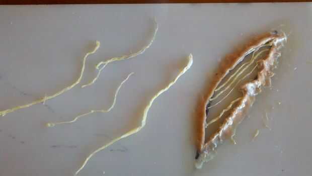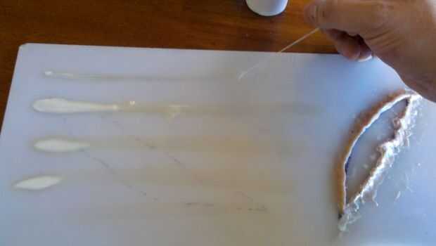 Comenzar por pelar el extremo para arriba y girando en los dedos, hará que el látex se adhiera a sí mismo, creando un hilo de látex, debe ser imperfecto y torcido.