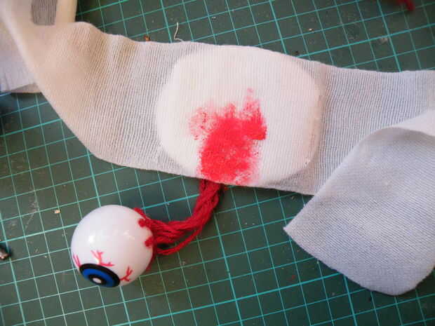 Añadir una mancha de sangre empapa con algún colorete, lápiz labial, plumas de fibretip o pintura para el parche.