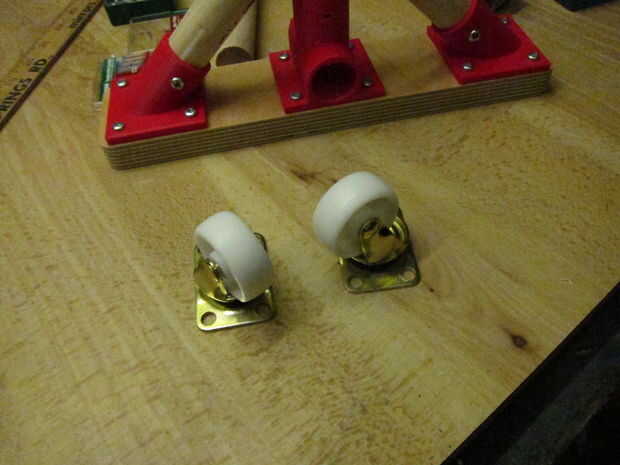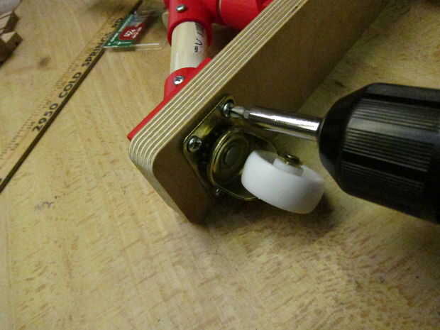 Coloque las ruedas en la parte inferior de la tabla usando tornillos #8 X 8. Trate de no golpear los tornillos que sujetan el soporte de 1 en lugar del otro lado.
