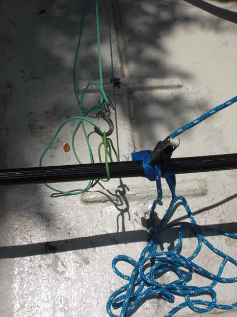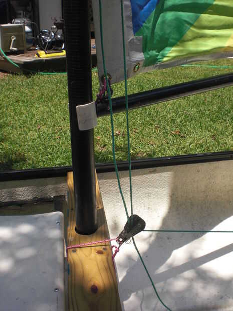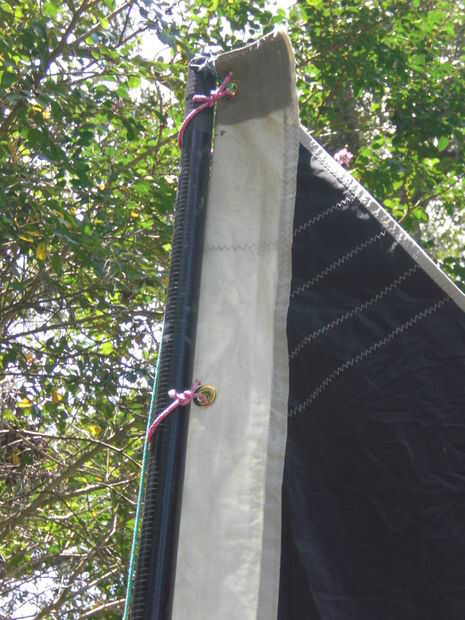 La vela original tenía una funda para el mástil, que es simple y eficiente, pero sentí debía ser capaz de energía-abajo a toda prisa, substituido el borde luff con ojales de bronce y aros de cuerda y me adjunta una polea driza a la parte superior del mástil. También corrí el otro extremo de la driza hacia abajo de la cabeza de la vela por lo que puedo bajar la vela en lugar de contar con graviity. Sellé el interior del mástil con espuma en aerosol, por si acaso.