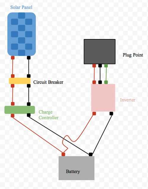 Siga los vínculos en el diagrama del circuito. Los hilos rojos son positivo, negro negativo. El cable rojo entre el inversor y el punto de conexión es en vivo, el negro es neutro y el verde es tierra o toma de tierra.