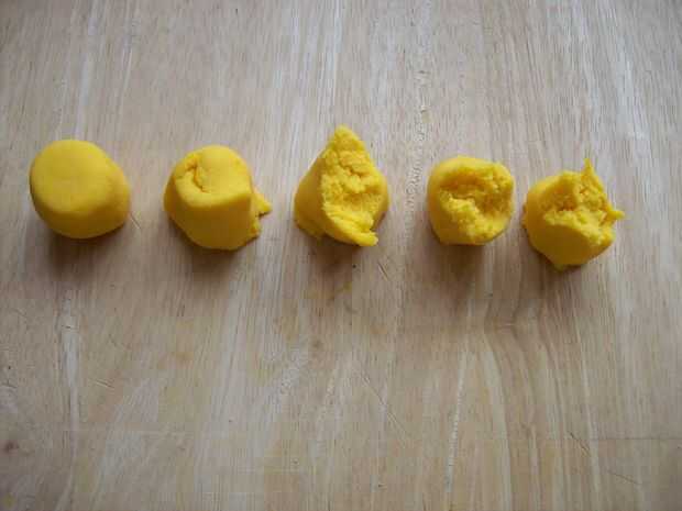 8) luego dividirla en cinco masas pequeñas. Cada masa pesa unos 20 gramos.