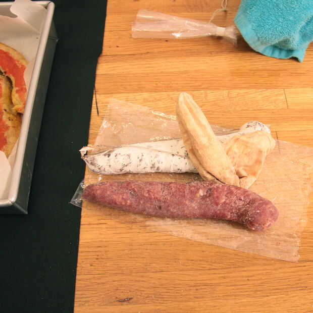 No me fotos de esto mientras yo estaba haciendo esto, pero pelado de la cubierta del salami y cortan en un ángulo. Usé esto para formar el colon.