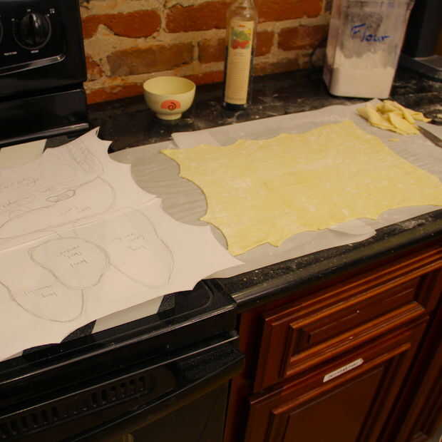 Usé un poco de agua para conectar las dos piezas y entonces había rodado ligeramente hacia fuera. Luego corté alrededor de los bordes de mi plantilla de papel que podía utilizar como patrón. He puesto el papel encima de la masa y cortar alrededor de los bordes con un cuchillo de cocina.