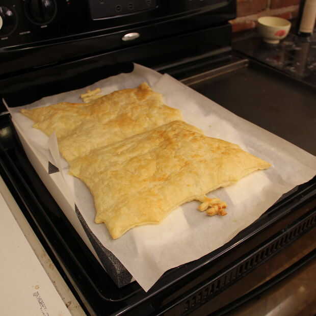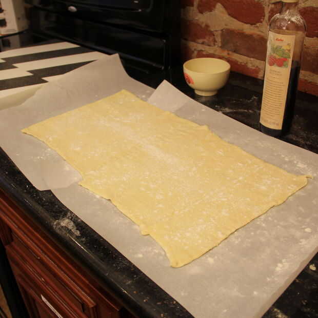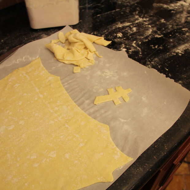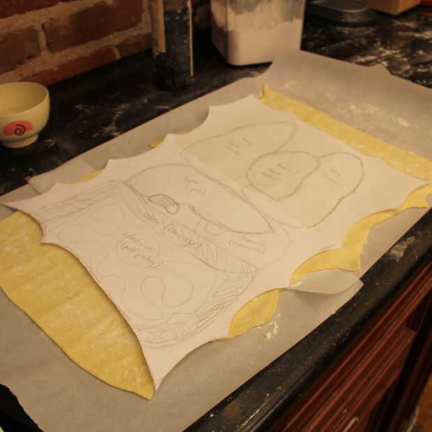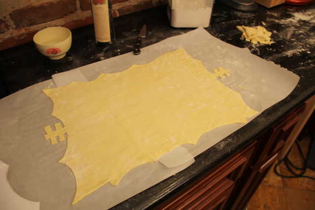 Luego utiliza algunas de las piezas extras de hojaldre cortar la parte superior e inferior de la "columna vertebral" y había pegada a la hoja de pasta con un poco de agua. :)