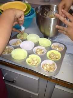 Cuchara mezcla en trazadores de líneas del muffin. Llenar cada uno 2/3 por completo. se deben hacer 12 muffins.