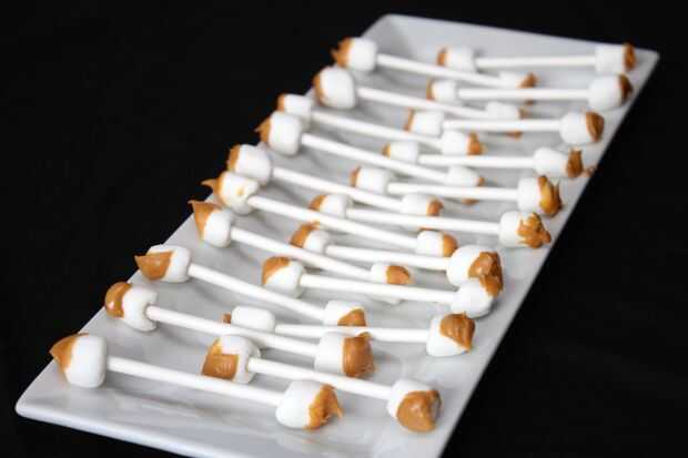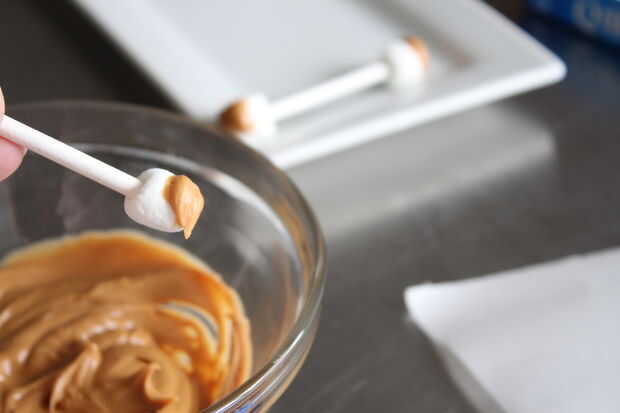 Empuje un mini malvavisco en cada extremo de la palanca de paleta y ya sea por inmersión en el cacahuete mantequilla o liso en con un cuchillo de mantequilla.