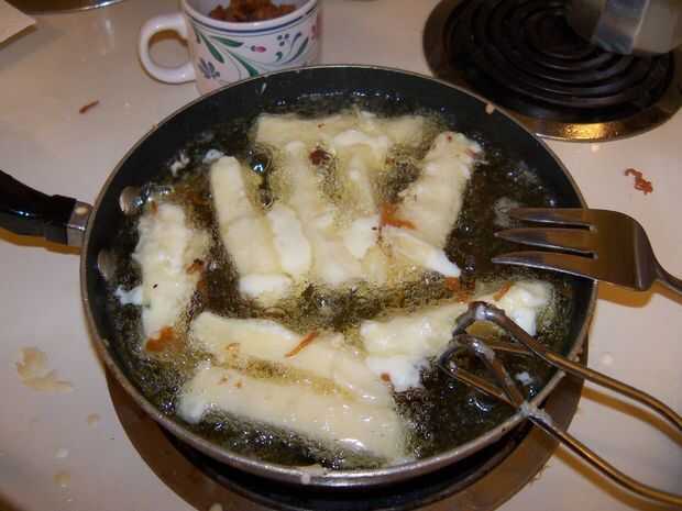 Palo de queso son probablemente los más difíciles de frituras profundas para hacer. Mozzarella tiene un contrato de arrendamiento para licuefacer (véase las fotos abajo).