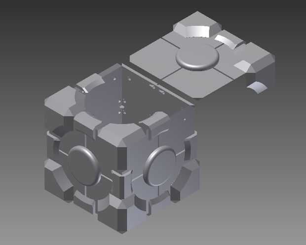 Después de un montón de fabricación de piezas en Autodesk Inventor (uso gratuito en los equipos de TechShop!) Terminé con los archivos de Inventor adjuntos a este instructable. He intentado diseñar el cubo ya cerca la versión en el juego como puedo conseguirlo, allí son no accesibles tornillos y solo una costura en la parte posterior donde se desliza la parte inferior del cubo de. Los canales en la superficie de mi versión del cubo (líneas de color rosa sobre el cubo original) se construyen para sostener EL alambre, por lo que el cubo puede brillar intensamente rosa como se ve en la imagen anterior, si usted mira de cerca.