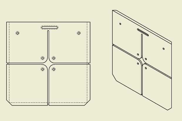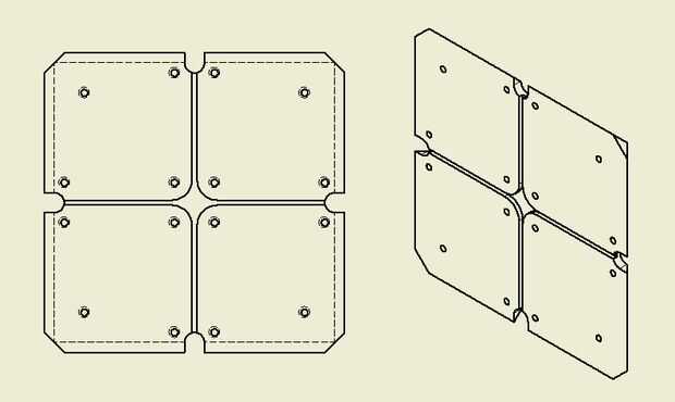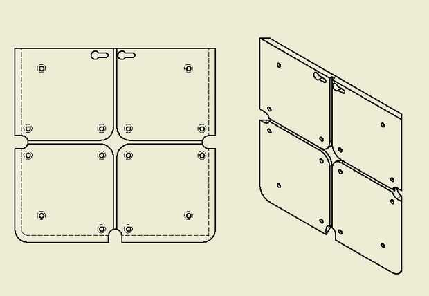 6) llevaba en todos los agujeros en el interior de la placa. Esto es opcional para todas las placas excepto la "cara arriba" que debe tener un equivalente bastante para que los tornillos son planos en la superficie (desde que se desliza a través de otra placa para abrir)