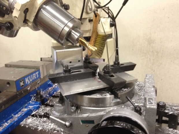 2) Monte el bloque a una chapa de fijación (ver imagen) y luego a una mesa giratoria, incline el cabezal del molino a 45 grados (ver imagen).