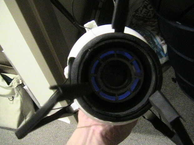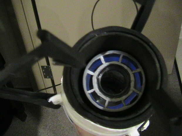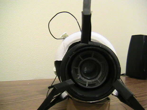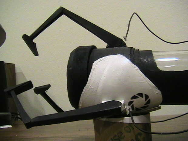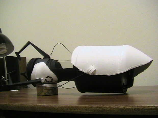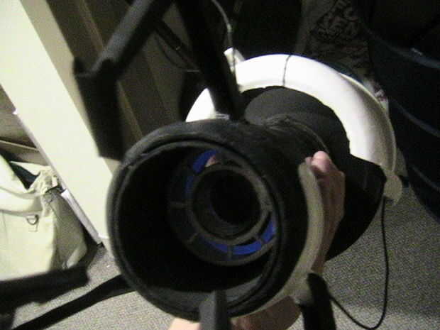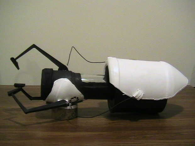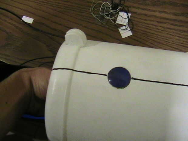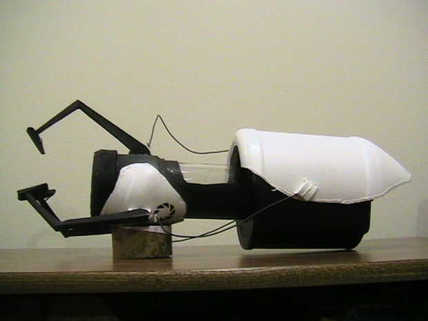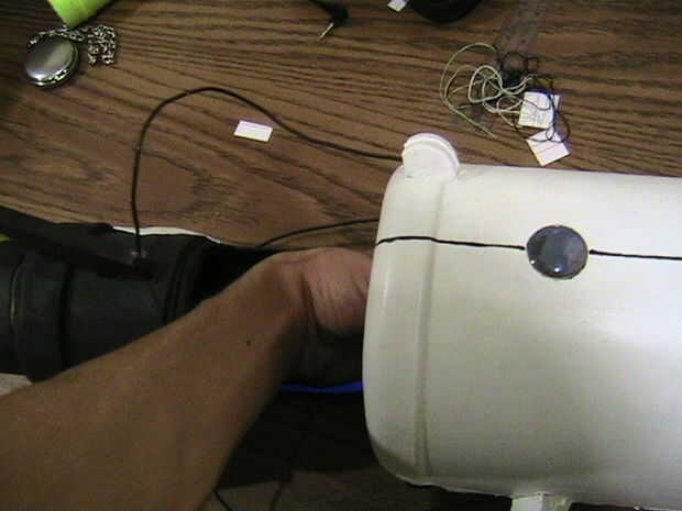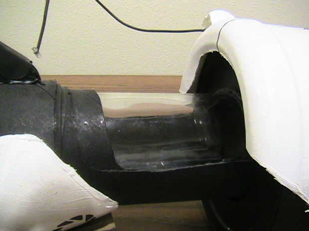 El arma está hecho de materiales reciclados. Las porciones de blanco y mango son cortados desde botellas de lejía, uno grande y uno pequeño. El cuerpo principal es una gran lata de cacahuetes. El cañón es una sección de tubo de cartón con una tira de espuma camping pegada al final. El tubo transparente es una botella de agua de vidrio fantasia mi compañero de cuarto había en el reciclaje. La marca se llama VOSS. Los brazos son cartulina y los cables de suspensión de capa. He tomado prestada una lata de pintura en aerosol negro de mi novia para el color.