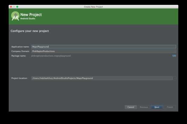 Cuando el cuadro de diálogo nuevo proyecto trata de arriba, elegir un nombre para tu app (usted puede dejar todos los campos como-es). Llamo mina MapsPlayground. Una vez que hayas elegido un nombre, haga clic en siguiente.