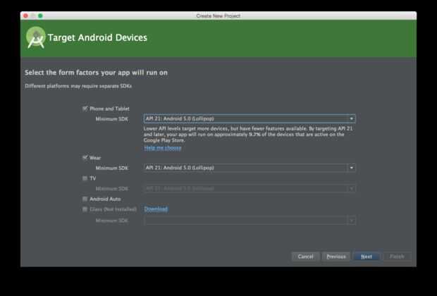 En esta pantalla siguiente, seleccione el SDK correcto que gustaría que esté la aplicación para compilar con. Si usted tiene un teléfono más nuevo, o planea usar usar Android, asegúrese de seleccionar API 21 o superior.