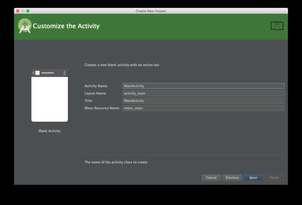 En esta siguiente pantalla, elija un nombre para su actividad. Para este tutorial, el valor predeterminado MainActivity es lo suficientemente bueno como para lo que necesitamos.