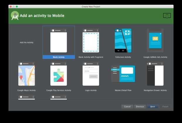 Aquí, estudio Android le da la opción para poder agregar algunos elementos iniciales para su aplicación. Porque este tutorial está construyendo desde el principio, vamos a ir con una Actividad en blanco.