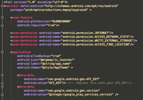 Ahora que ya tenemos todas esas claves de API configuradas en la consola de los desarrolladores, tenemos que cambiar los engranajes y configurar el AndroidManifest.xml en su proyecto. Así que, ¿qué estamos esperando para? Inicie el estudio Android y abra su AndroidManifest.xml. (si tiene un módulo de usar Android también, entonces abra que así se manifiestan y copie el código abajo en ambos archivos)