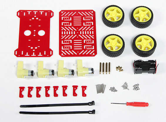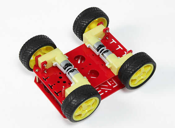 Después elige tu cerebro robot, debe elegir cómo se mueven. Esta es la parte más fácil. Necesitará al menos dos motores cepillados y un chasis. Usted puede crear su propio con sólo dos motores cepillados y algo de madera o usted puede comprar uno como lo hicimos. Nos recogió un chasis del Robot 4WD disponible aquí: http://www.hobbyking.com/hobbyking/store/__26250__4WD_Robot_Chassis_KIT_.html