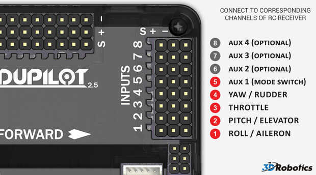 He incluido un diagrama de sitio web de arducopters que le ayudarán con este paso. Realmente tuve que cambiar los pernos elevador y alerón pero que pudo haber sido a causa de mi receptor específico. Asegúrese de que todos los cables son seguras porque no quiere se deslice. Si usted quiere ser capaz de cambiar entre los modos necesitará conectarse a uno de los conmutadores adicionales a aux 5. Tuve que usar mi interruptor de flaps.