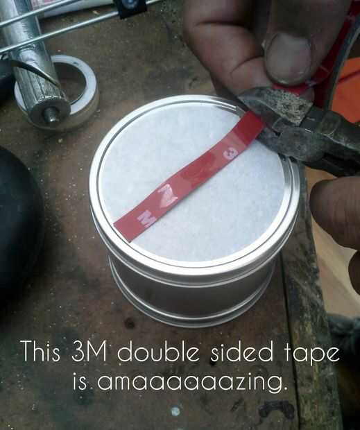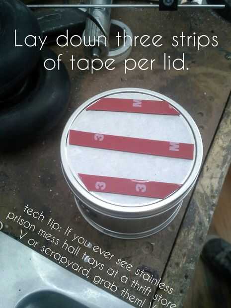 Tira las etiquetas tanto como sea posible. He probado tomando el papel de estas latas, pero el pegamento no es soluble en agua, por lo que sólo me voy. Soy demasiado viejo para disparar a la perfección. Poner algunas tiras de cinta de doble cara en los párpados, tres tiras deben hacerlo. ¿Puede usar epoxi o pegamento del poliuretano para esto, pero quiero hacer antes de la cena, o no? ---Consejo---en la foto en la parte inferior izquierda de la figura 3 es el borde de una bandeja de cena mágica que presumiblemente fue utilizado en una prisión. He encontrado algunos de estos en el patio de chatarra y recientemente marcó un montón más en una tienda de segunda mano. Si tienes los medios, recomiendo recoger uno. Los compartimentos son muy útiles para la organización de partes de nada que tienes que desmontar y montar rápidamente. El acero inoxidable es fácil de limpiar para un brillo impecable con alcoholes minerales, lo que es realmente fácil de limpiar los rodamientos mientras trabaja.