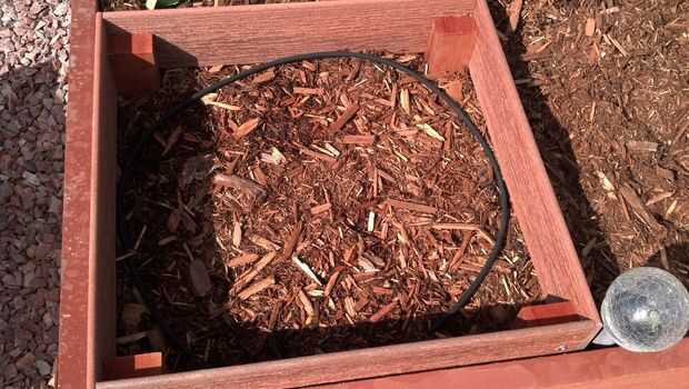 Aquí tengo el primer anillo y un bucle de la manguera de remojo. En algún lugar debajo de eso buena tierra y abono son 5 púrpura semilla de papa.