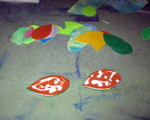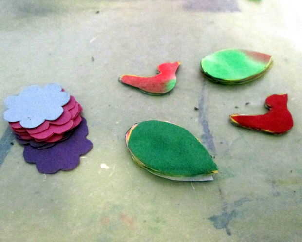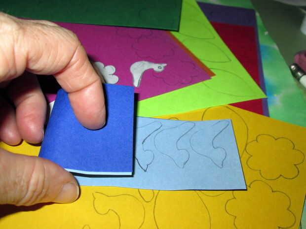 Comenzar a pegar las formas, extendiendo el pegamento alrededor de la superficie del papel y apilar para arriba de las formas. Sobre todo querrá pegamento cerca de los bordes exteriores, pero no quieres también un charco. Presione la pila de vez en cuando para exprimir hacia fuera de pegamento extra. Utilice papel encerado para proteger su mesa y también para evitar pegado a su mesa.Dejar que seque durante la noche.