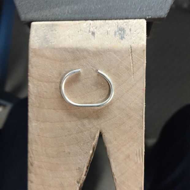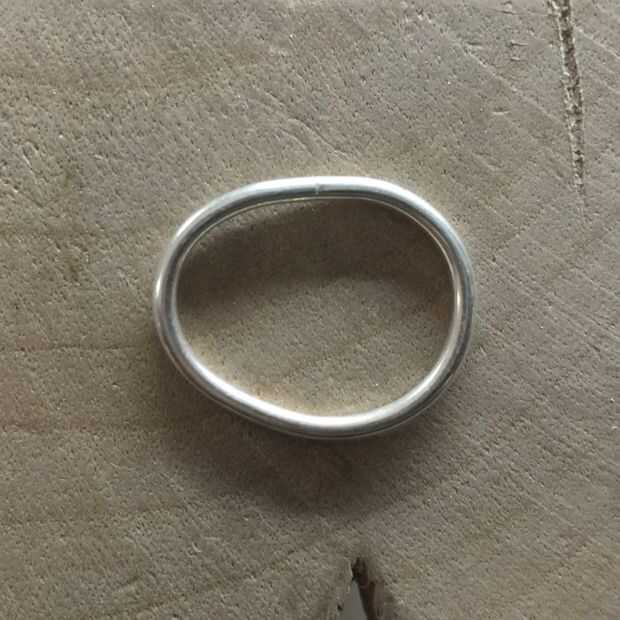 2. Con el mazo hueco, martillo de los extremos hacia abajo para empezar a cerrar el óvalo. La forma ovalada que la soldadura sea más fácil. Aplane el anillo colocando sobre una superficie plana y dura y golpeando con la cara llena del mazo de golpe muerto. Llevar los extremos con alicates de punta de aguja o los dedos. Es muy importante que los extremos queden alineados y enjuague. Usted conseguirá una costura de soldadura mucho más agradable si se pone un poco de esfuerzo extra en esta. Si mantiene la costura hasta la luz, no debe ver cualquier luz brille a través. Si los dos extremos no están al ras, separe los extremos ligeramente y presentar los bordes altos. Cuando haya terminado, usted debería poder apenas Dile que la costura está allí.