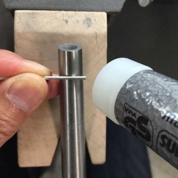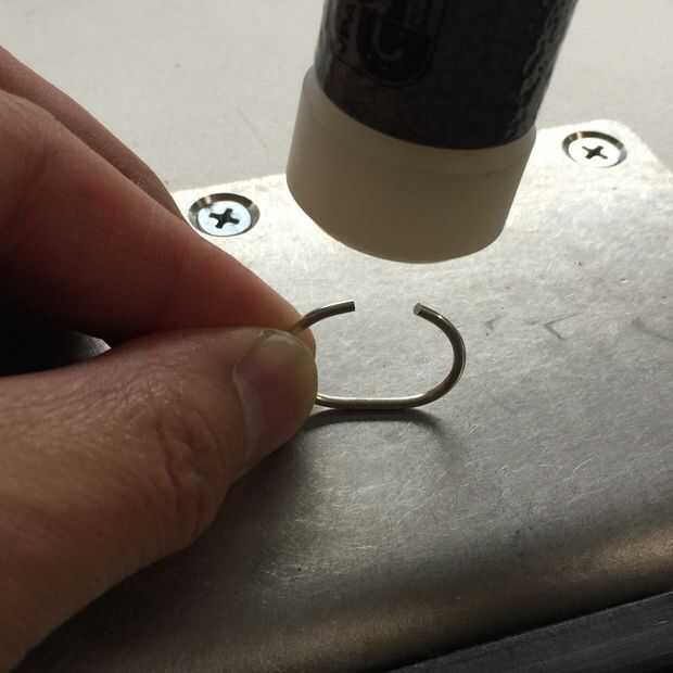1. Utilizando un mandril anillo, coloque el cable en un diámetro ligeramente más pequeño que el tamaño de su anillo. Con el alambre que se pega un poco más allá del punto de contacto, pulsar abajo en el extremo con un martillo de golpe muerto cara de nylon. El alambre empieza a doblar. Haga avanzar el cable 1 mm o 2 y golpear el alambre hasta que casi se curva por la mitad. Lo mismo al otro lado. Usted debe terminar con una pieza casi oval.