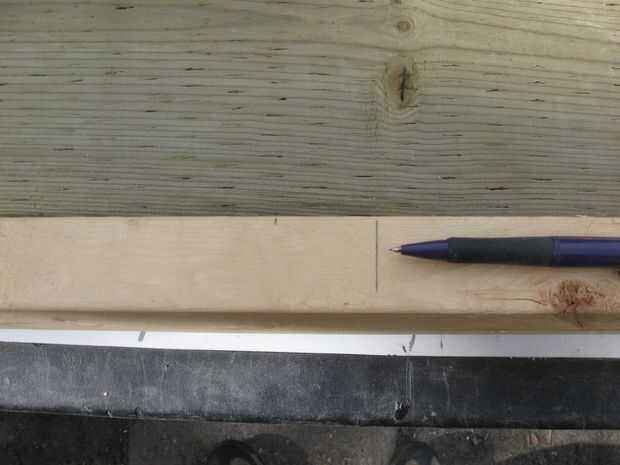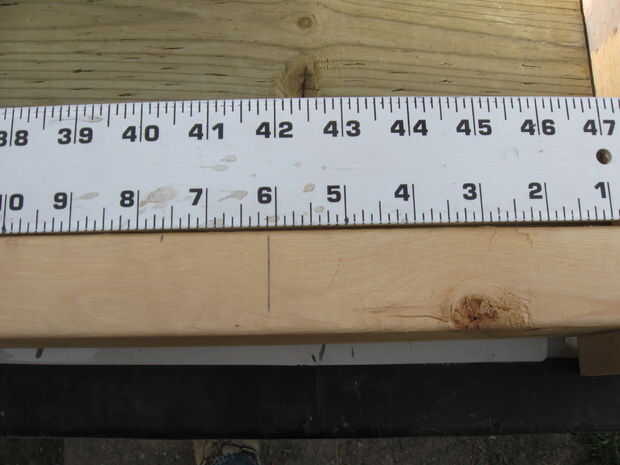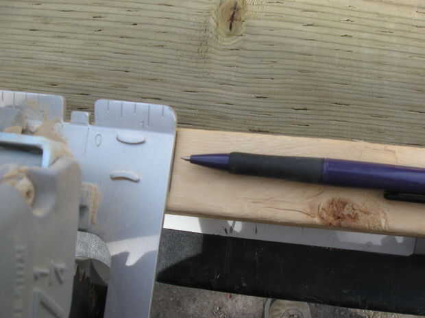 Se necesita determinar el ancho de 3 secciones de su material de bloque. Esto fue medido para ser un poco más de 7,5 pulgadas. Esto fue marcado como la línea de corte en la plantilla. Se midió el zapato de mi sierra y otro pedazo de madera fue colocada en el borde del zapato y atornilla. Esto permite de corte capacidad de repetición,