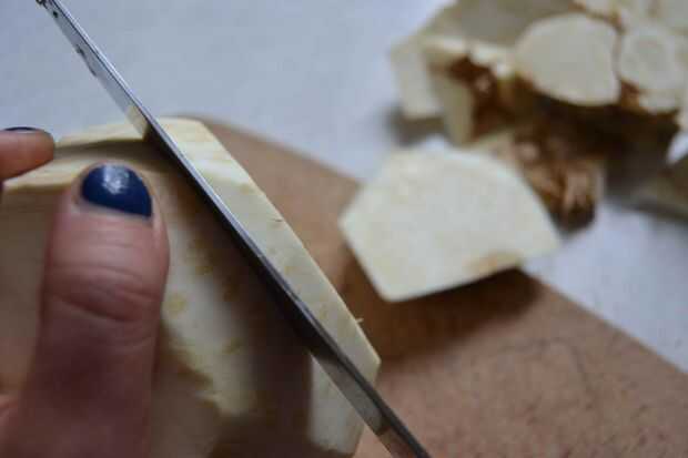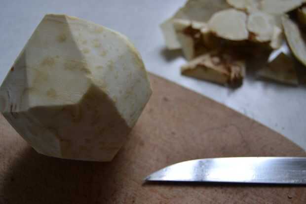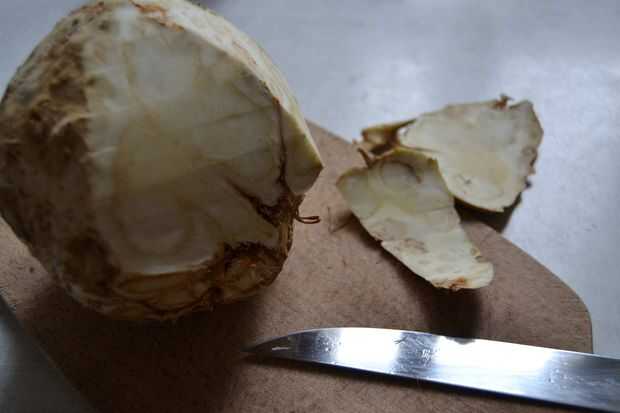 mientras tanto, con un cuchillo, pelar el apio y cortarlo luego en rebanadas de aproximadamente 1 cm de espesor.