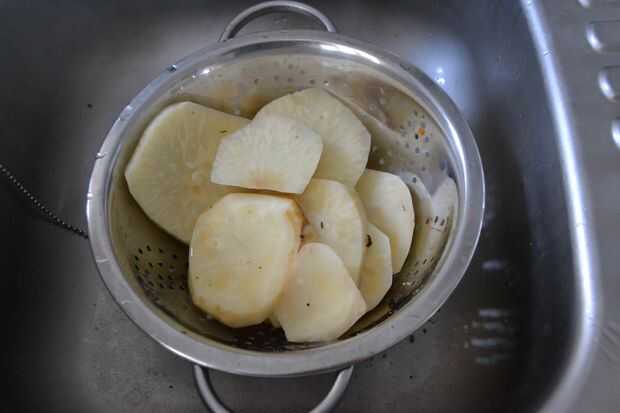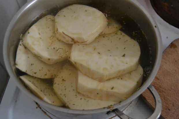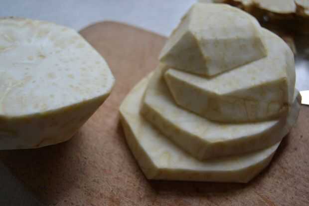 Cuando el agua hierva, añadir las rodajas de apio nabo y hervir hasta que estén apenas blandos (5-10 minutos). Escurrir las rebanadas y dejar enfriar un poco.