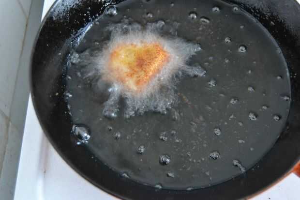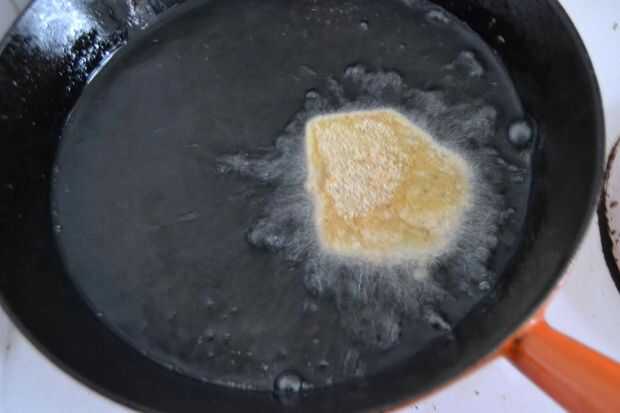 calentar aceite para freír en una sartén. el aceite está suficientemente caliente si poco las burbujas se forman en el extremo de una cuchara de madera insertado en el aceite.