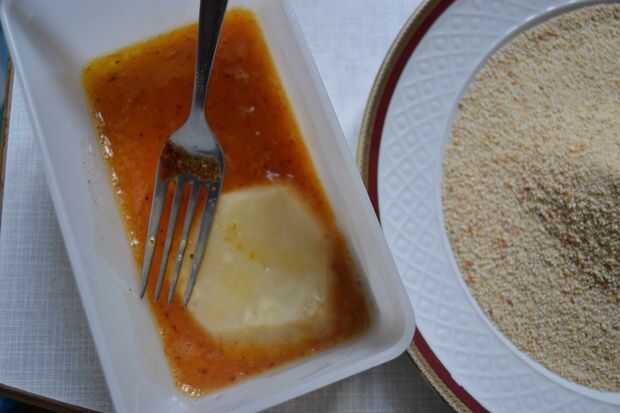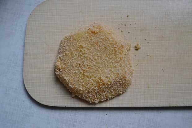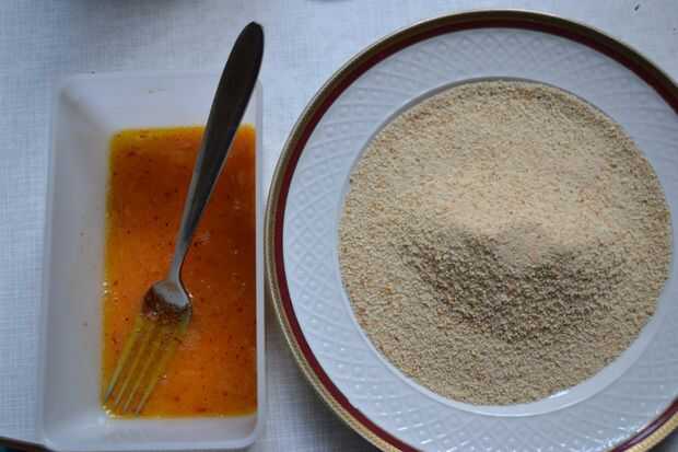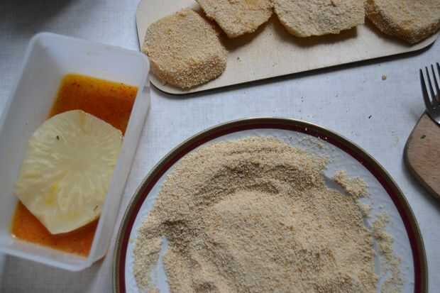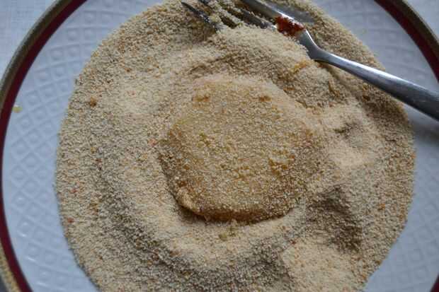 rebanada a la vez, primero la capa cada rebanada en el huevo y que en la miga, asegúrese de que están cubiertos uniformemente.