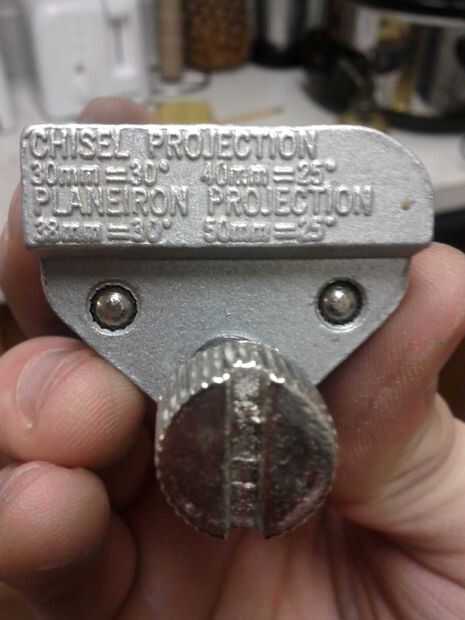 Una vez que determina el ángulo de esta puede configurar la herramienta en la guía de Afilamiento. Mina tiene medidas de referencia al lado para que sepas cómo ahora la hoja hacia fuera más allá de la guía para el ángulo deseado del proyecto. Ya que quería algo un poco menor que 25 º puse el hierro plano unos 56 mm lejos del borde delantero de la guía de Afilamiento y había apretado para arriba.