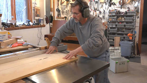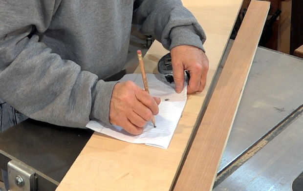 Corté un pedazo de 1/2" MDF de 6" ancho de la base de la plantilla. Esto debe ser dos veces tan largo como el ancho de su mesa de trabajo. Mi banco es 32" de ancho así que hice la plantilla cerca de 65" de largo.