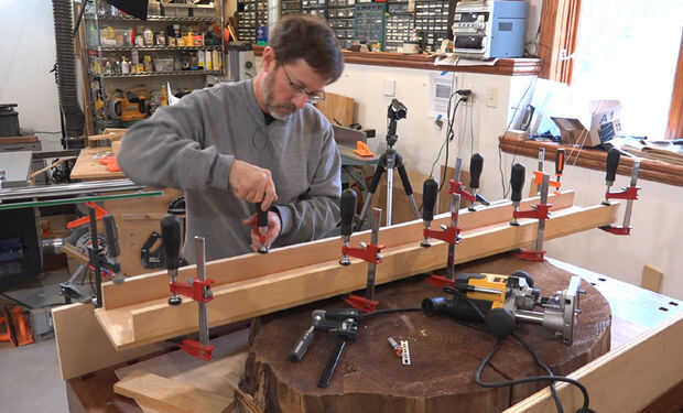 Los lados de la plantilla son dos piezas de madera contrachapada de 3/4" que son cerca de 2" de ancho. Simplemente con abrazadera y había pegado a los bordes de la pieza base.