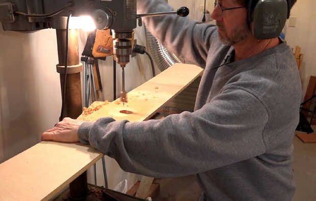A continuación, transferir la ubicación de los orificios a la pieza de MDF y taladrar dos orificios avellanados para montar el router a la plantilla. Después de perforé un agujero en el centro de donde vendría la broca a través.