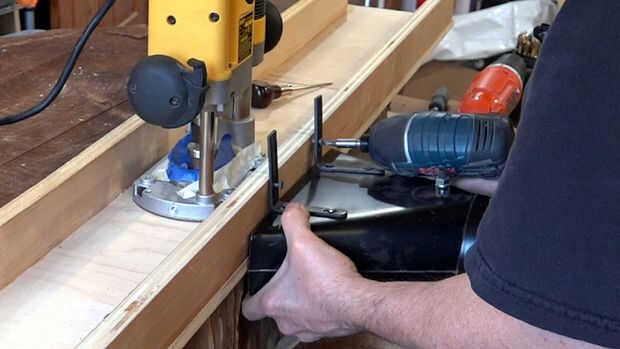 Lo primero que hice fue construir una plantilla simple para mantener el router. La plantilla está a sólo 3 piezas de madera contrachapada o MDF con un router atornillada en el centro. También he añadido un canal inclinado del polvo.